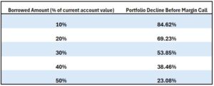A typical portfolio holding all ETFs has an initial margin requirement of 60%, meaning the investor can borrow up to 60% of the account value. With an all-equity portfolio, the typical initial margin requirement is 50%. At most custodians, the typical maintenance margin requirement is 30% for ETFs and 35% for equities. These numbers are crucial in determining the amount that can be borrowed against the portfolio and the resulting margin of safety before there’s risk of a margin call.